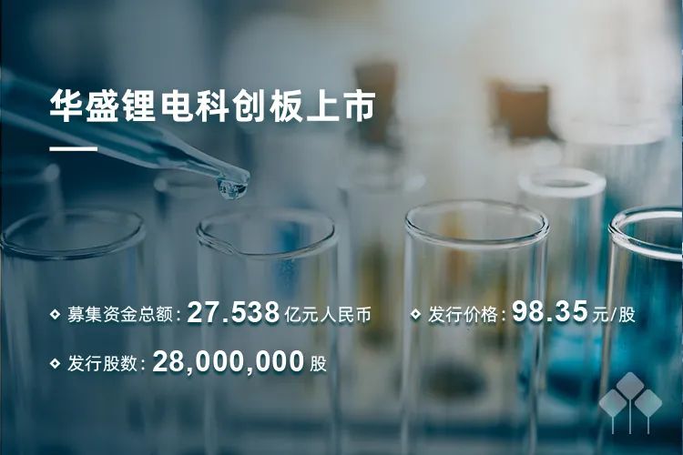 2022年7月13日,锂电池电解液添加剂领导品牌江苏华盛锂电材料股份有限公司(以下简称“华盛锂电”)成功在上海证券交易所科创板上市,成为A股首家锂电池电解液添加剂企业。华泰联合证券担任独家保荐机构及主承销商。
