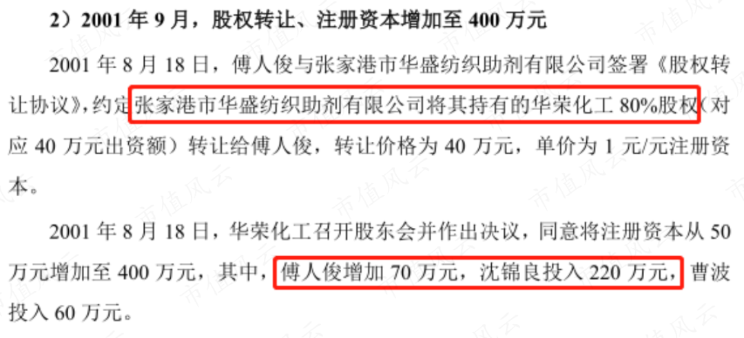 2000年9月,华盛助剂厂(股份合作制)更名为张家港市华盛纺织助剂有限公司(下称华盛有限),沈锦良持有华盛有限约58.5%股权,为控股股东。