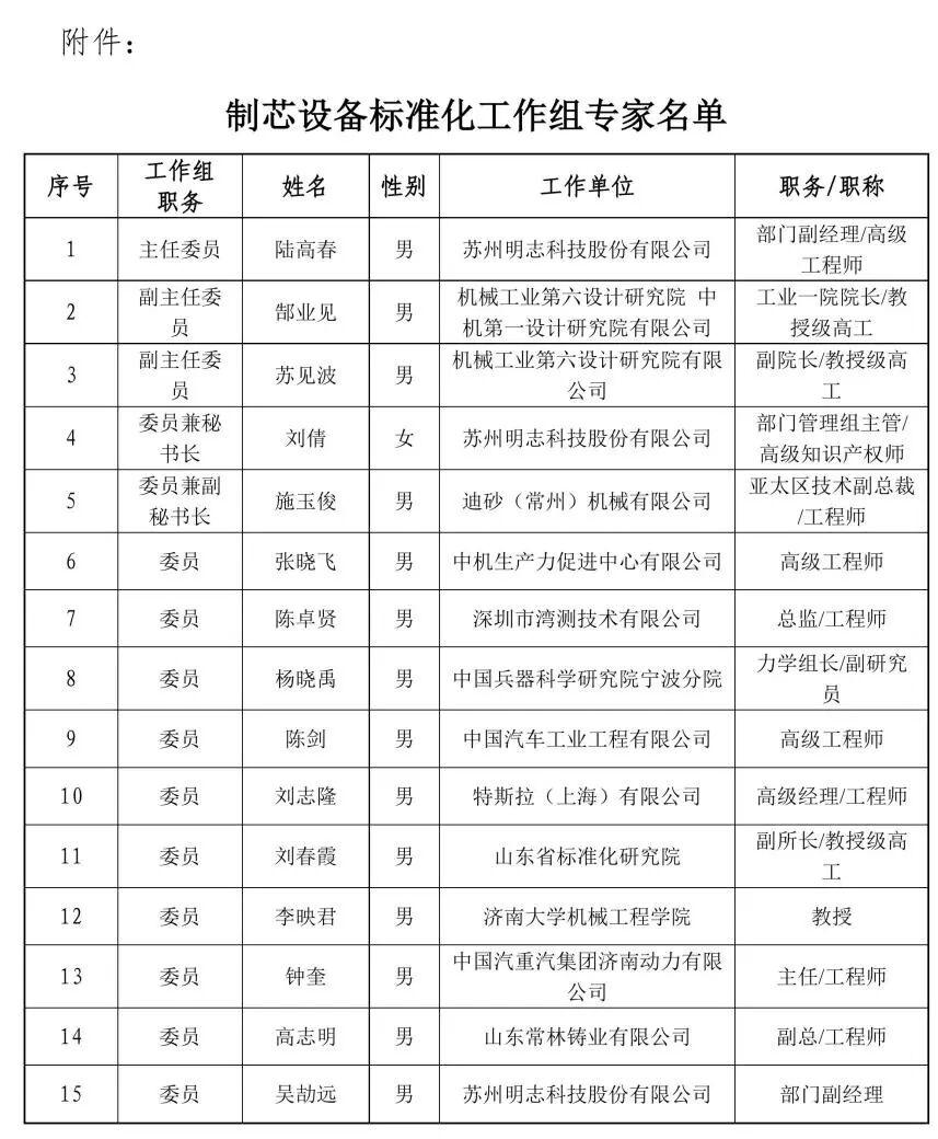 本工作组汇聚国内高校、研究所、检测机构及行业知名企业的15名专家组建而成,由 明志科技 陆高春担任主任委员。工作组将在SAC/TC186秘书处指导下,聚焦制芯设备领域国家标准、行业标准的立项、制定与修订核心职能开展工作。