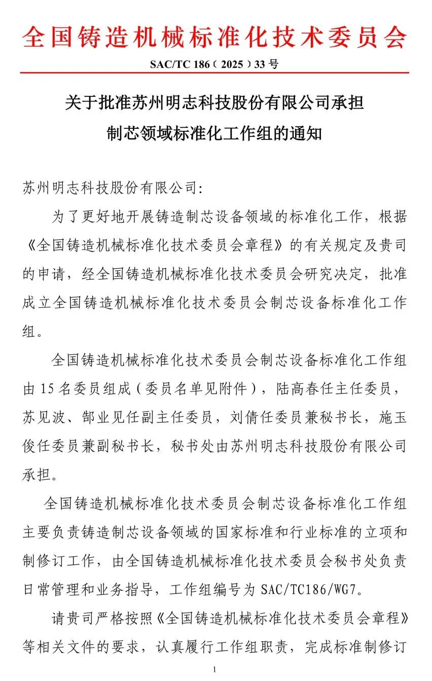 根据全国铸造机械标准化技术委员会SAC/TC186﹝2025﹞33号文件批复,全国铸造机械标准化技术委员会“制芯设备标准化工作组”(编号:SAC/TC186/WG7)正式成立,秘书处由苏州 明志科技 股份有限公司(以下简称“ 明志科技 ”)承担。