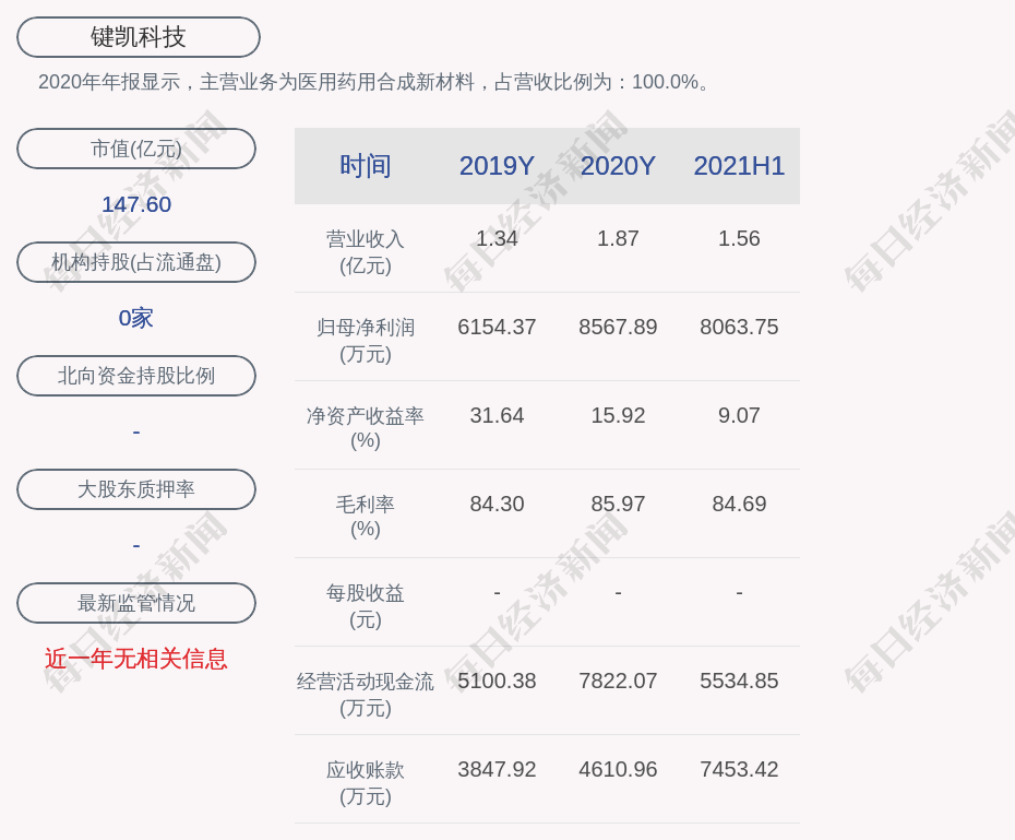 2020年年报显示,键凯科技的主营业务为医用药用合成新材料,占营收比例为:100.0%。