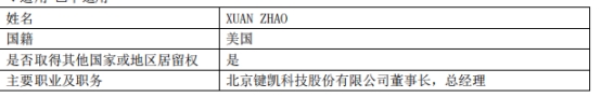 键凯科技2022年年报显示,公司控股股东、实际控制人XUAN ZHAO为美国国籍。