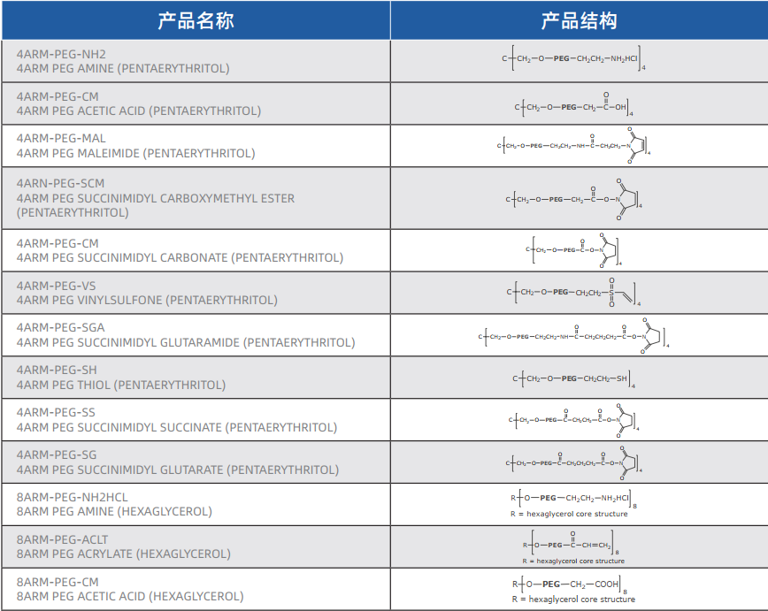 键凯科技(688356.SH)提供多种可用于医疗器械的多臂聚乙二醇衍生物及配套技术服务。多臂聚乙二醇衍生物根据其核的不同,又分为三臂、四臂、六臂、八臂、十臂等聚乙二醇衍生物,分子量是所有臂分子量的总和。键凯可以提供多种结构式的多臂聚乙二醇衍生物,用于制作具有致密性网格结构的水凝胶。同时,键凯可提供GMP与非GMP级别、分子量5000到40000Da的任意臂数的聚乙二醇原料或其衍生物。