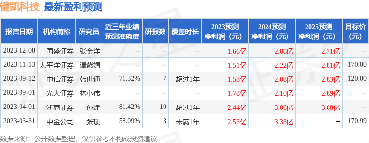 证券之星数据中心根据近三年发布的研报数据计算,浙商证券孙建研究员团队对该股研究较为深入,近三年预测准确度均值高达81.42%,其预测键凯科技2023年度归属净利润为盈利2.44亿元,根据现价换算的预测PE为19.61。