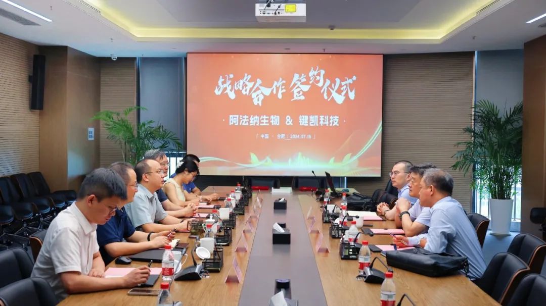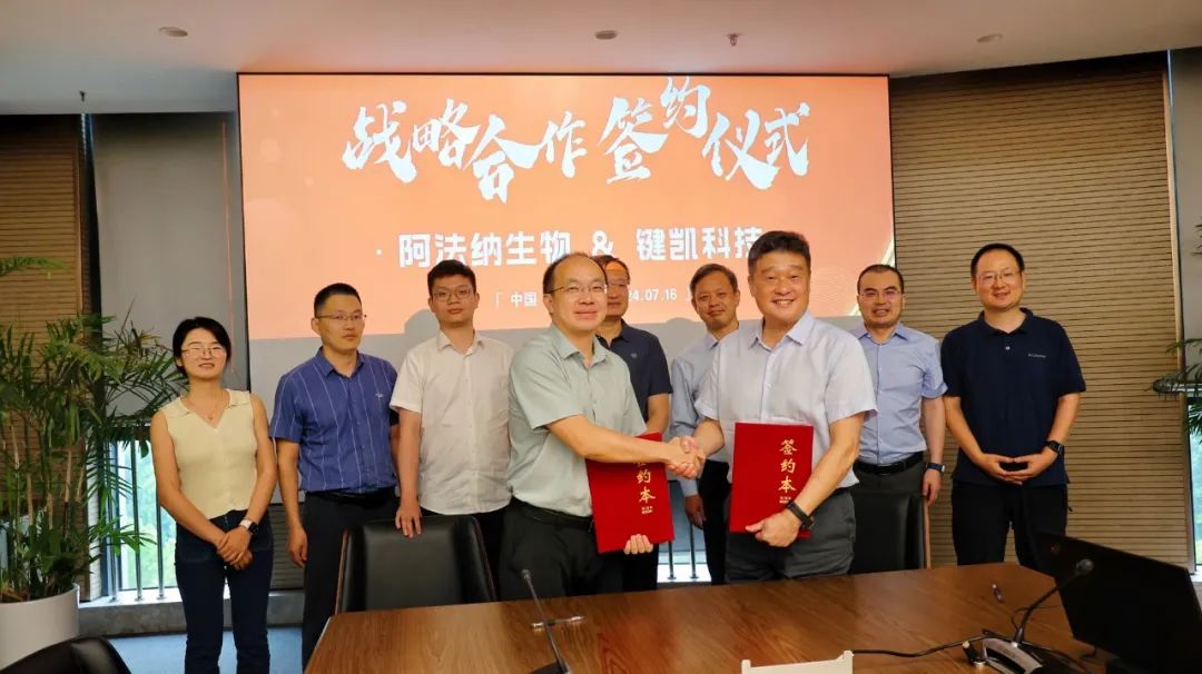 2024年07月16日,合肥阿法纳生物科技有限公司(以下简称“阿法纳生物”)与北京键凯科技股份有限公司(以下简称“键凯科技”,股票代码:688356.SH)达成重要战略合作。双方将在生物医药领域开展深入合作,共同推动阳离子脂质、高分子辅料等关键辅料的研发与产业化进程。阿法纳生物创始人王育才教授与键凯科技董事长赵宣代表双方签订协议。