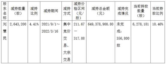 此外,2022年公司曾披露持股5%以上股东减持股份结果公告。公告显示,股东刘慧民通过集中竞价和大宗交易减持公司股份264.32万股,减持股份数量占公司总股本的4.41%,本次减持价格区间为211.67-317.88元/股,套现6.49亿元。
