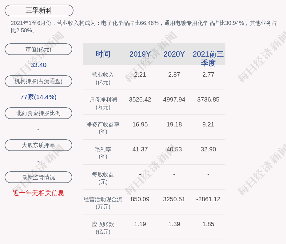 2021年1至6月份,三孚新科的营业收入构成为:电子化学品占比66.48%,通用电镀专用化学品占比30.94%,其他业务占比2.58%。