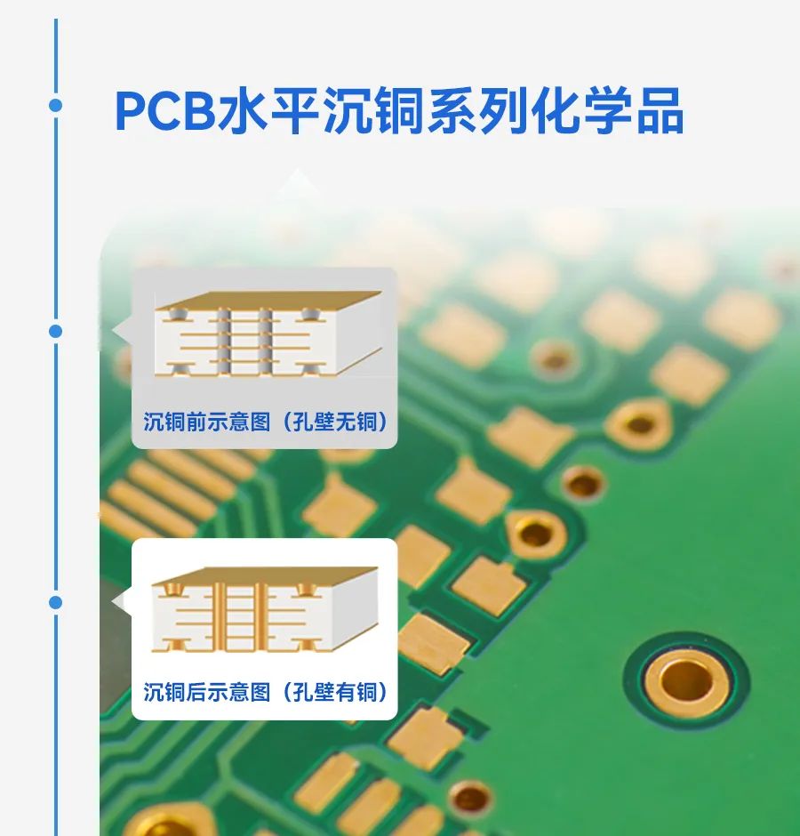 水平沉铜工艺是PCB制造过程中的重要工序,主要作用是将钻孔孔壁金属化,从而实现PCB各层间电气互联。PCB水平沉铜化学品技术壁垒较高,皓悦新材的是少数掌握该技术的内资厂商之一,公司PCB水平沉铜专用化学品制备及应用技术适用于HDI板及高纵横比板的生产,对于盲孔、通孔均能沉积良好的化学铜层。