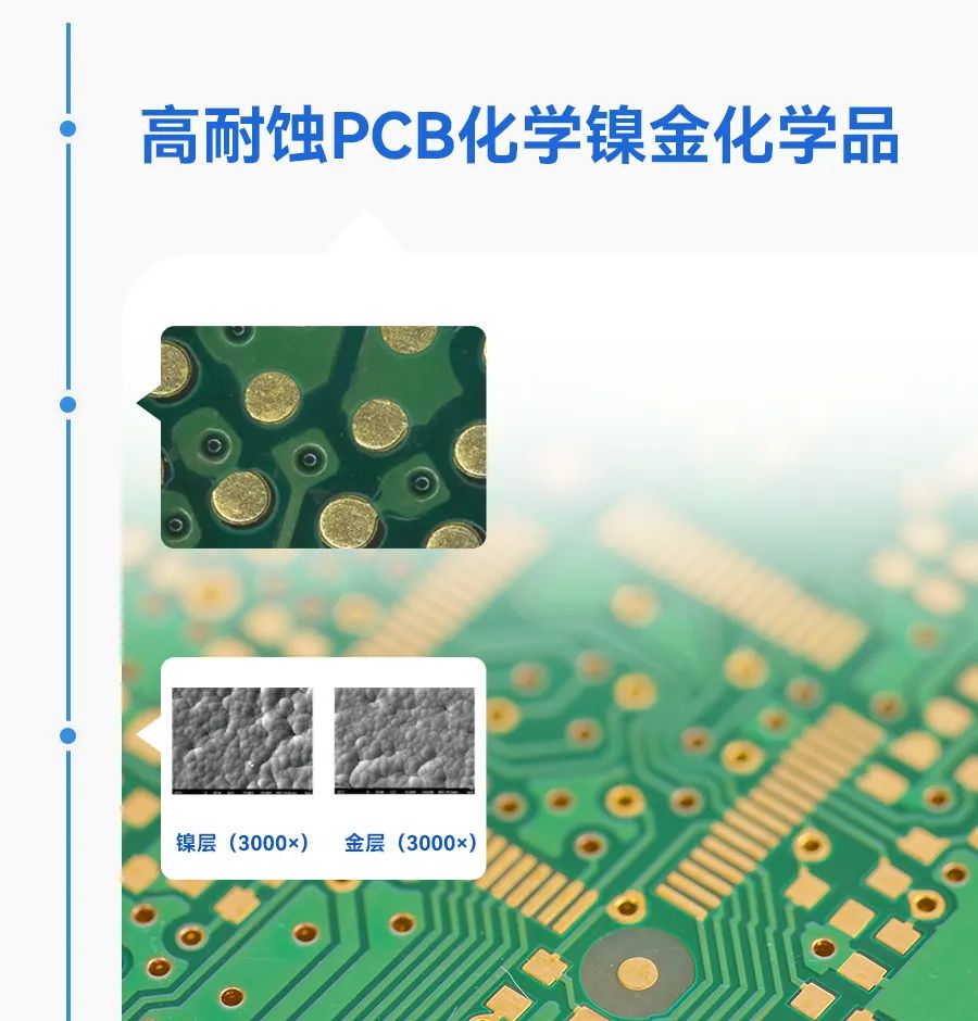 化学镍金是在PCB裸铜表面化学镀一层镍和金,提高PCB板的耐腐蚀性、抗氧化性和可焊接性。皓悦新材高耐蚀PCB化学镍金工艺不仅确保镀层表面平整度高,镀层结合力优异,金层抗氧化能力出色,耐蚀性强,且不含铅、镉,并大幅减少金盐耗用,展现突出的环保性和经济性。皓悦新材PCB化学镍金专用化学品制备及应用技术达到国内行业领先水平。
