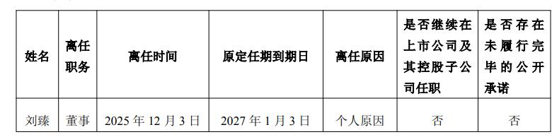 公告显示,深圳 中科飞测 科技股份有限公司董事会近日收到刘臻书面辞职报告,其因个人原因,于2025年12月3日申请辞去公司第二届董事会董事职务,原定任期到期日为2027年1月3日,辞职后不再继续在上市公司及其控股子公司任职,也不存在未履行完毕的公开承诺。