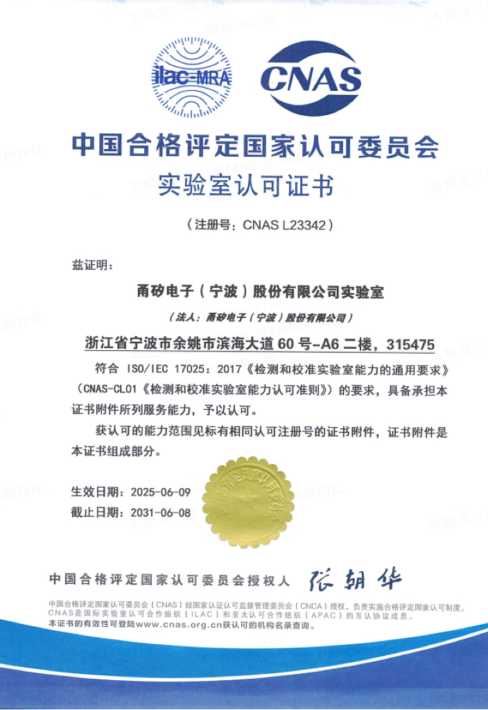 甬矽电子(宁波)股份有限公司实验室(以下简称:甬矽电子实验室)于2025年6月9日成功通过中国合格评定国家认可委员会(CNAS)的严格评审,正式获CNAS认可资质(证书编号:CNAS-L23342),标志着甬矽电子实验室的管理水平与服务能力符合ISO/IEC 17025国际准则要求,具备国家及国际认可的可靠性检测能力。