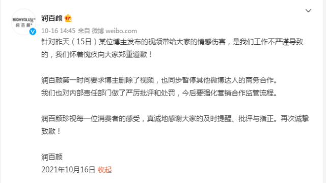 润百颜方面已删除了上述微博,并于10月16日发布了道歉声明,称是“工作不严谨导致的,怀着愧疚向大家郑重道歉”。