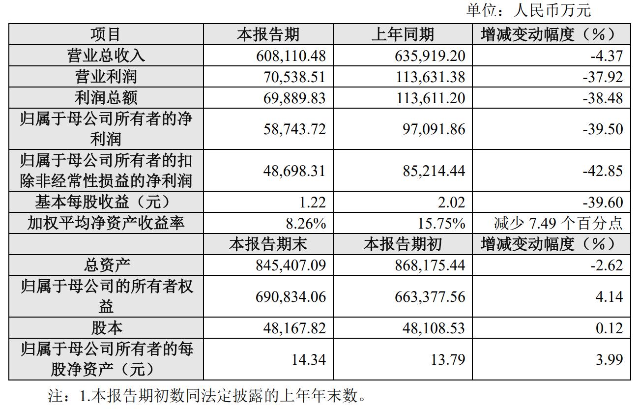 华熙生物2023年实现归属于母公司所有者的净利润5.87亿元,比上年同期的9.7亿元下降39.5%;扣非净利润4.87亿元,比上年同期的8.52亿元下降42.85%。