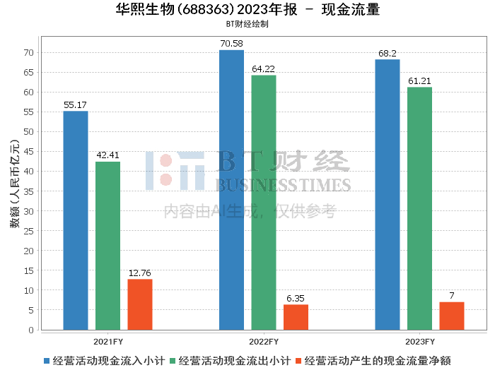 现金流量方面,华熙生物2023年经营活动产生的现金流量净额为6.99亿元,同比增长10.15%。经营活动现金流入小计为68.20亿元,同比下降3.36%;现金流出小计为61.21亿元,同比下降4.70%。投资活动产生的现金流量净额为-6.13亿元,亏损减少。筹资活动产生的现金流量净额为-1.02亿元,同比下降显著。整体来看,公司在经营活动现金流方面表现较为稳健,但在投资和筹资活动方面仍需进一步优化。