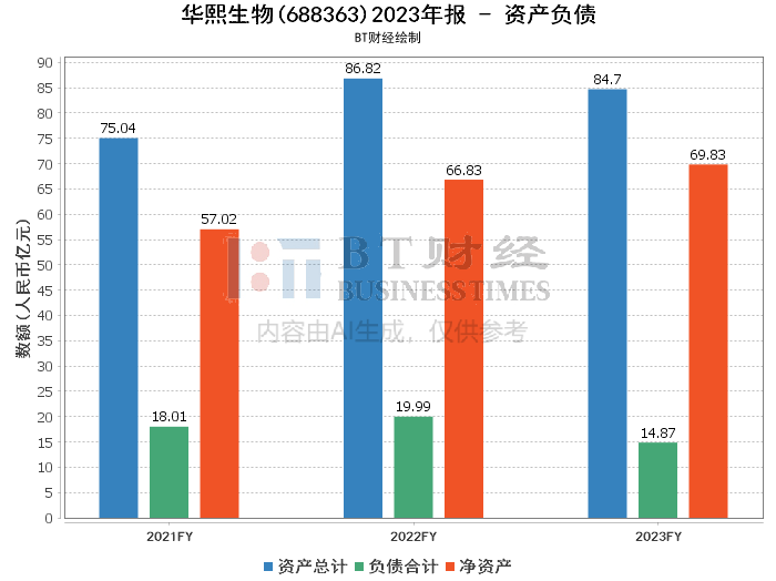 2023年末,华熙生物的总资产为84.70亿元,同比下降2.44%。其中,期末资产总计为84.70亿元,期初为86.82亿元。负债合计为14.87亿元,同比下降25.61%,期初为19.99亿元。商誉期末余额为2.51亿元,较期初的2.47亿元略有增加。净资产方面,期末余额为69.44亿元,较期初的66.34亿元增长了4.68%。资产负债率从2022年的23.02%下降至2023年的17.55%,显示出公司在降低负债方面取得了一定成效。