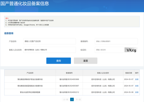 笔者通过国家药监局国产普通化妆品备案平台查询发现,目前为止,揽华生物共备案3款“繁妆”品牌普通化妆品,上述两款次抛产品备案时间为今年5月7日;还有一款未上市的产品,“繁妆水油双萃轻润稳弹面膜”,备案时间为5月8日,从备案的产品包装来看,产品功效为舒缓保湿、稳护肌肤屏障。