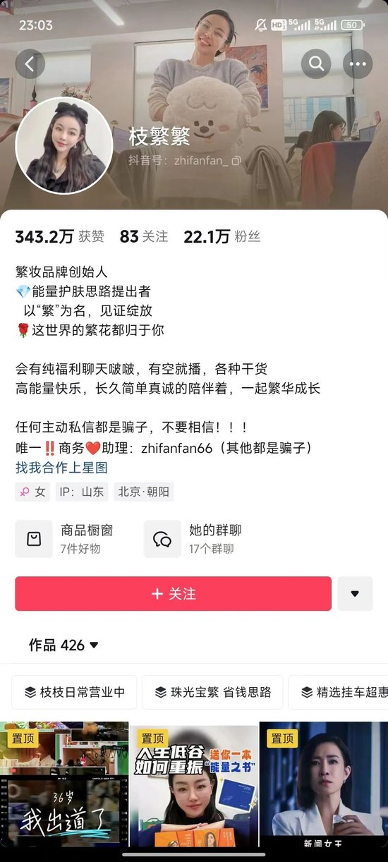 6月23日,社交平台上突然出现不少关于枝繁繁自创美妆品牌“繁妆”的消息,她抖音账号主页上的简介也已经换成了“繁妆品牌创始人”。