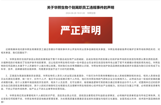 6月26日晚间,华熙生物发布《关于华熙生物个别离职员工违规事件的声明》,如下图所示: