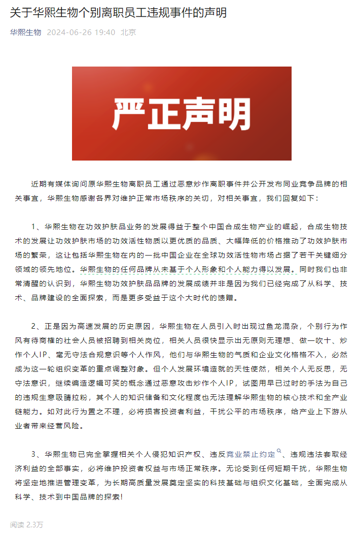 据新美势报道,近日,化妆品上游产业资深人士石大开针对华熙生物与前员工枝繁繁之间的纠纷发表了看法,引发了广泛关注。新美势表示,这场争议源于枝繁繁在离职后对华熙生物的频频指责,并且华熙生物也不得不正面回应。