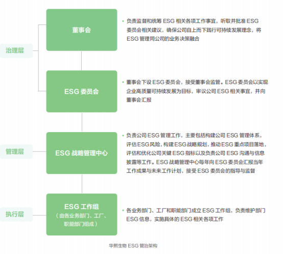 为了不断完善可持续发展管理,华熙生物建立了行之有效的ESG管理机制,形成了层次清晰、分工明确的ESG管治架构,为公司的稳健经营和可持续发展提供有力保障。公司在董事会下设ESG委员会,以实现企业高质量可持续发展为目标,审阅公司ESG相关事宜,并向董事会汇报。同时,经董事会审议批准,公司新设ESG战略管理中心,负责公司的ESG管理工作。