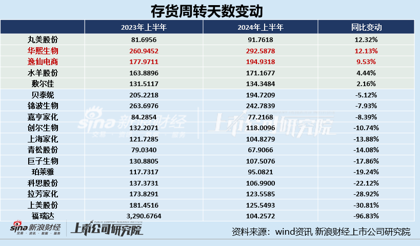 在存货周转效率下降的5家上市公司中,又2家上市公司的存货周转天数超过半年,分别为华熙生物、逸仙电商,2024年上半年存货周转天数分别为292.59天、194.93天,分别同比增长12.13%、9.53%。