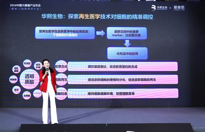 9月20日,在2024中国大颜值产业年会上,华熙生物董事长兼总裁赵燕发表主题演讲《生命科学颠覆美妆未来》,首次全面阐述了该公司在再生医学领域的布局与规划。这家以透明质酸为外界所闻名的企业,正试图将护肤品的功效提升到细胞和基因层面,开创美妆行业的新纪元。