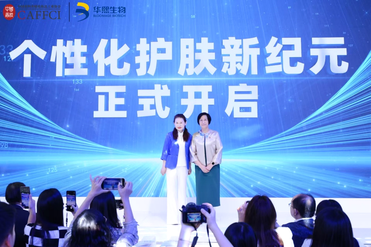 华熙生物董事长兼CEO赵燕与中国香料香精化妆品工业协会理事长颜江瑛为个性化定制护肤门店工作站揭幕