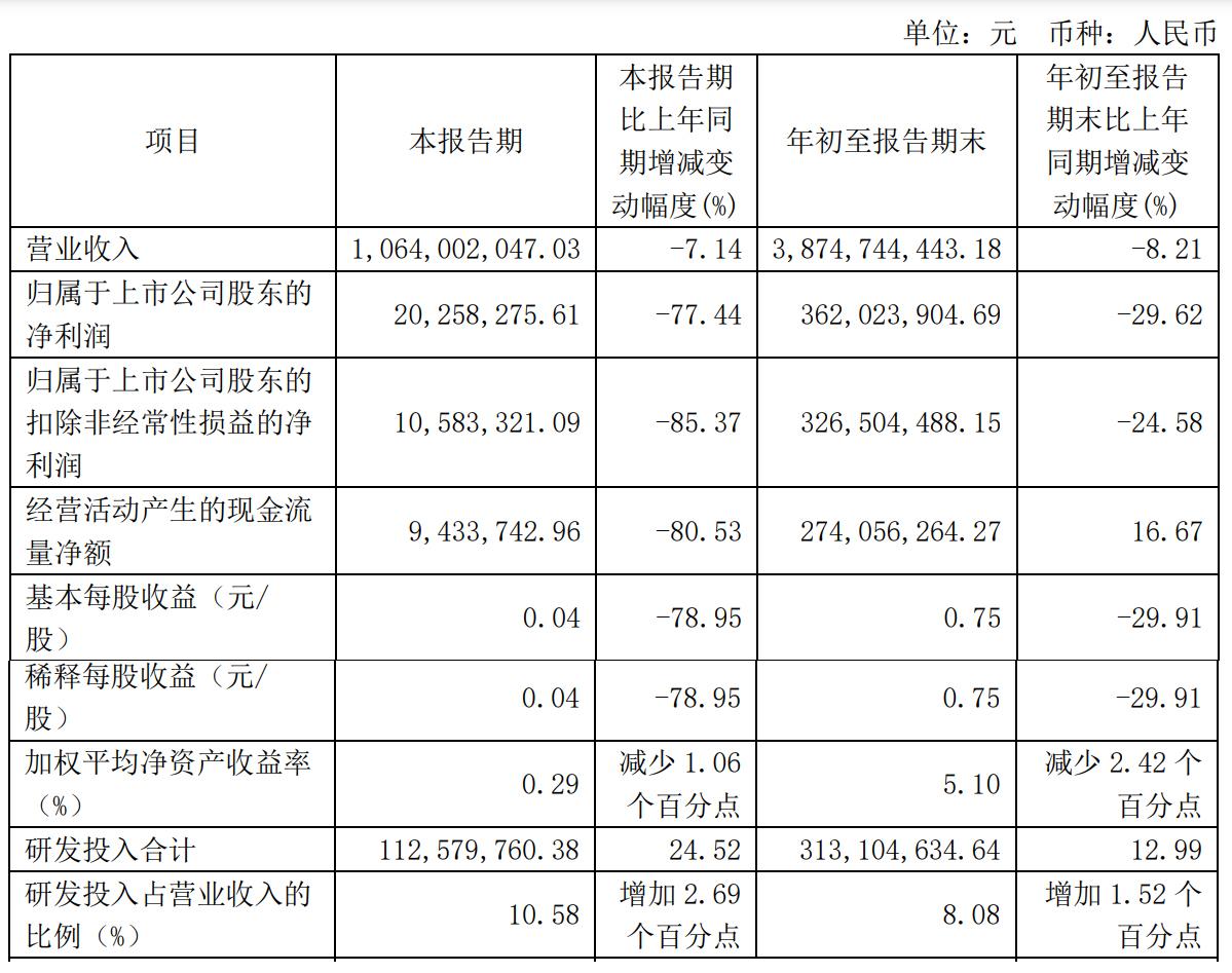 华熙生物2024年第三季度营收为10.64亿元,同比下降7.14%;净利为2026万元,同比下降77.44%;扣非后净利为1058万元,同比下降85.37%。