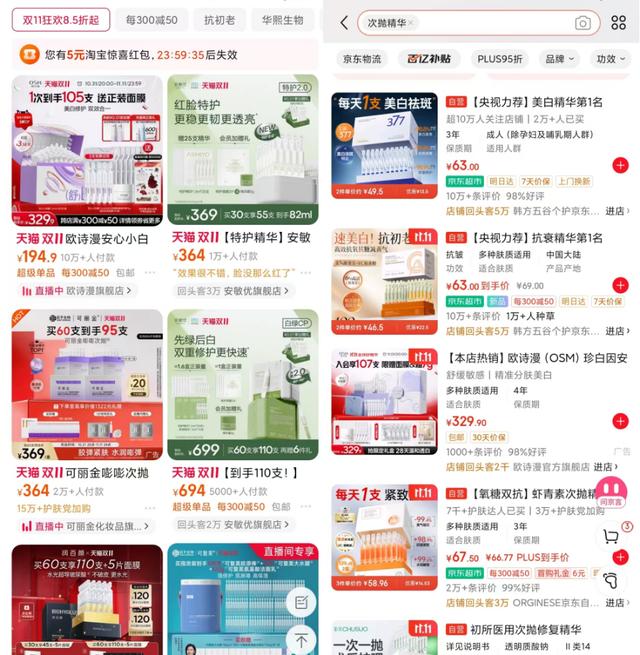 过去在电商平台搜索“次抛精华”,华熙生物的产品往往是最先出现,现在基本被竞品挤了下去。