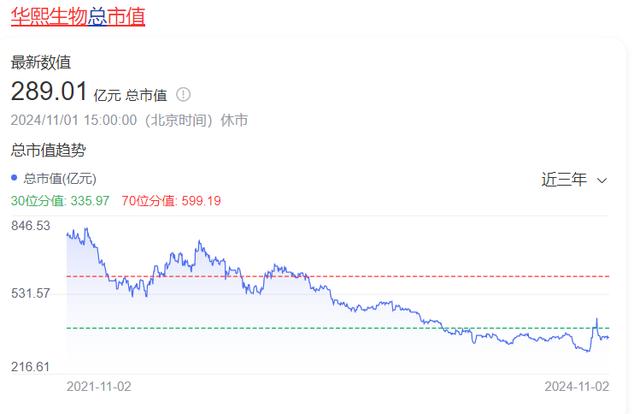 于是2023年,华熙生物遇上了自2019年上市以来首次年度营收、净利双降的情况。直到目前,华熙生物都没能扭转业绩下滑,市值也从巅峰期的1500亿跌至300亿左右。