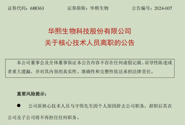 2024年4月2日,华熙生物发布公告称,核心技术人员马守伟因个人原因辞去公司职务,辞职后其在公司及子公司将不再担任任何职务。马守伟在2021年9月至2024年3月期间,任华熙生物上海研发中心功能性护肤品开发总监,主要负责基础配方技术和功能性产品配方研发。