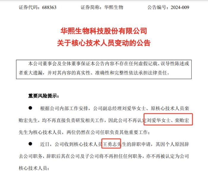 2024年4月30日,华熙生物公告称,根据公司内部工作安排,公司副总经理刘爱华、原核心技术人员栾贻宏,均不再直接负责研发相关工作,因此公司不再认定刘爱华、栾贻宏为核心技术人员,两位仍然在公司任职负责其他重要工作。