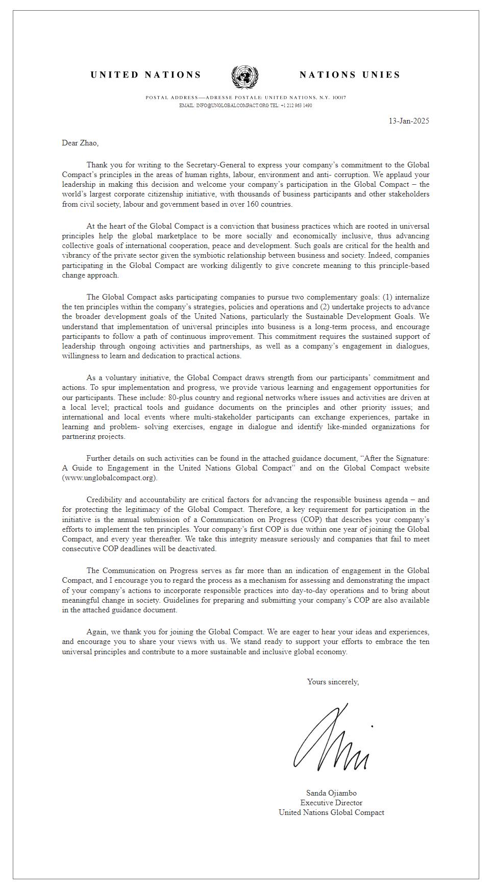 2025年1月15日,华熙生物正式加入联合国全球契约组织(United Nations Global Compact,简称 UNGC)。这一里程碑式的举措,标志着华熙生物在推动全球可持续发展方面的努力与承诺赢得国际认可。