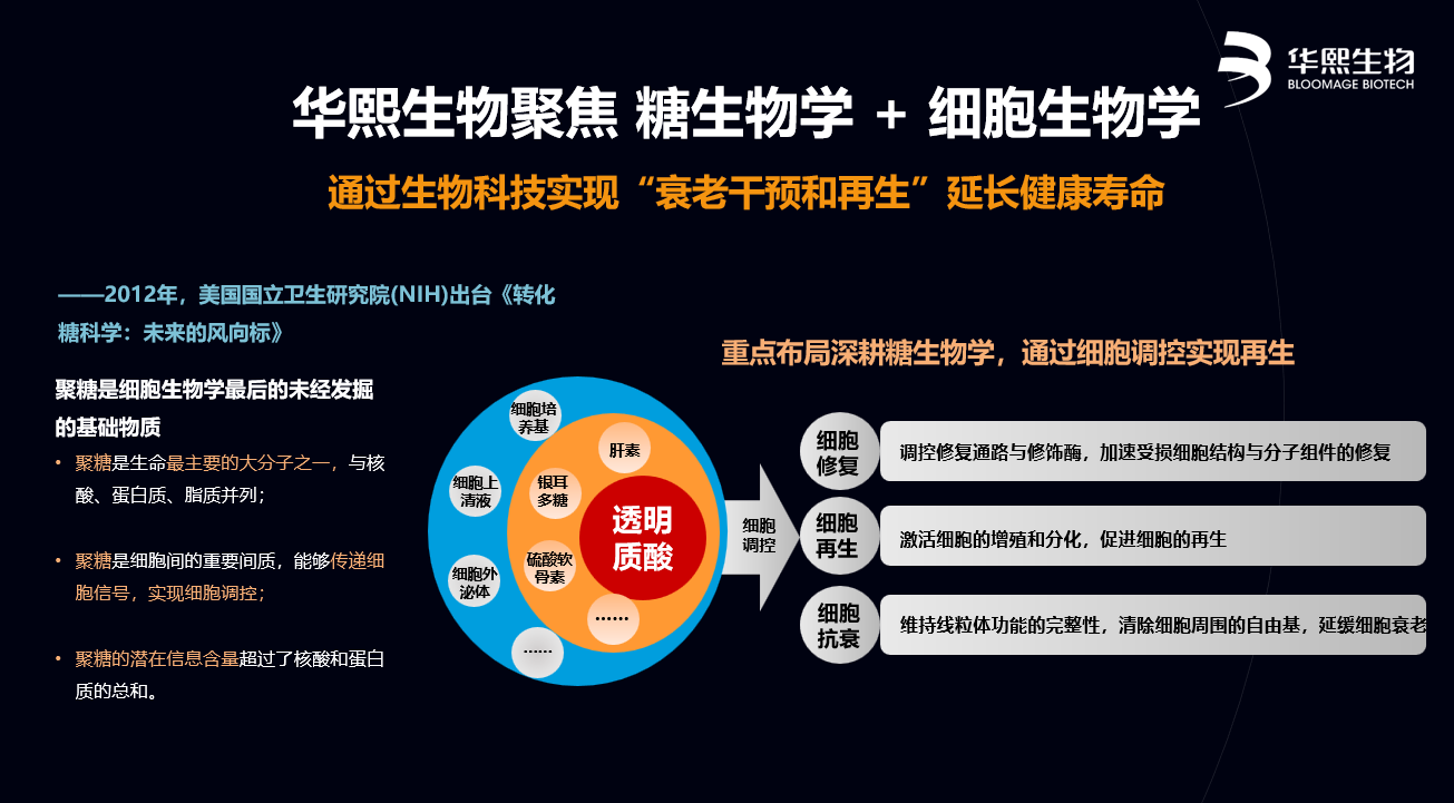 另一方面,依托在透明质酸领域长期的研究储备以及高效的转化能力,华熙生物已经开始不断去探索各类聚糖对人类健康的作用,比如肝素、硫酸软骨素、母乳寡糖、唾液酸、岩藻糖、葡聚糖等,成功构建起属于自己的糖库,为后续的科研与应用奠定了坚实基础。同时,华熙生物布局细胞生物学,持续探索细胞级抗衰,通过对细胞种类、功能的调控和优化,来实现对组织功能的恢复,实现对机体功能的恢复,以此提高生命质量。