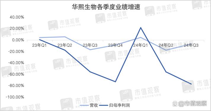从图表不难看出,从2023年到2024年,华熙生物的创收、创利指标几乎都呈负走向,特别是后者,波动之余还伴随着很大的振幅。