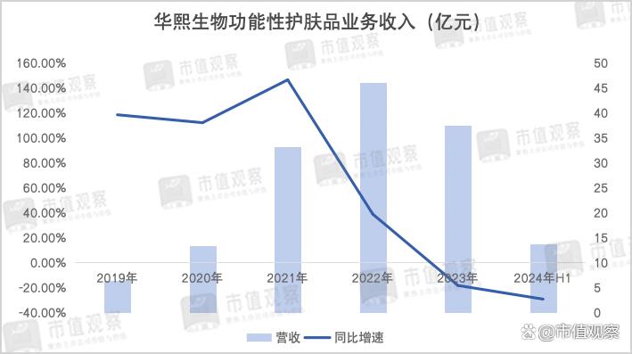 2023年,其功能性护肤品业务实现收入37.57亿元,同比下滑18.45%,2024年上半年继续下滑29.4%至13.81亿元,占总营收的比重缩小到49.13%。