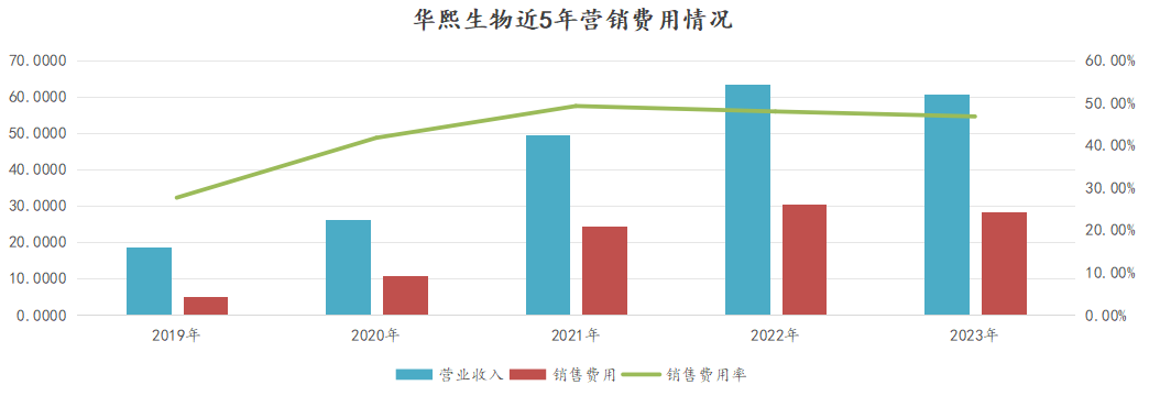 2019年-2023年,华熙生物营销费用翻了五倍,营销费用率从27.65%增长至46.78%,期间曾一度接近50%。华熙生物的产品流连于范冰冰、薇娅、李佳琦直播间,业绩表现却在触底、触底、再触底: