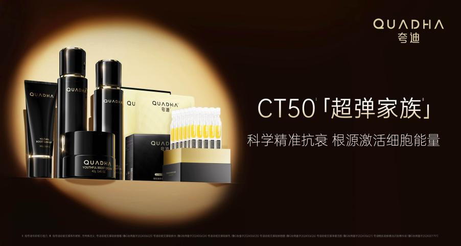 夸迪的品牌定位是“冻龄?抗初老”,技术升级为“以生物科技赋能精准抗衰”。依托细胞生物学及再生医学研究平台,基于肌肤衰老在细胞层面深度探究能量因子与抗衰因子的协同作用,聚焦细胞内源,焕活肌肤能量。夸迪CT50超弹系列的推出,直接把“精准抗衰”这个概念打进了消费者心里。