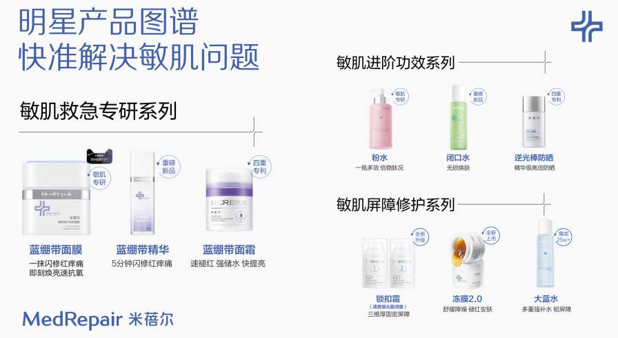 米蓓尔的定位升级为“专注皮肤神经免疫学的受损肌肤专业护理品牌”。它的打法很硬核,基于公司细胞生物学及皮肤神经免疫学研究平台,将“蓝绷带”系列打造成“受损肌肤的根源性护理解决方案”。