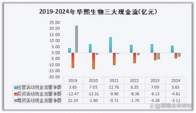 数据显示,2024年华熙生物的三大现金流“两负一降”,显示公司正面临资金链压力。其中,经营活动现金流净额同比下降19.32%至5.65亿元,主要是因销售回款相应减少所致;投资活动现金流净流出4.61亿元,筹资活动现金流净流出3.11亿元,偿债能力边际弱化。