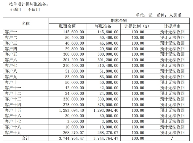 值得一提的是,2024年单项计提坏账客户达19家,合计374.48万元应收账款“预计无法收回”,100%计提。