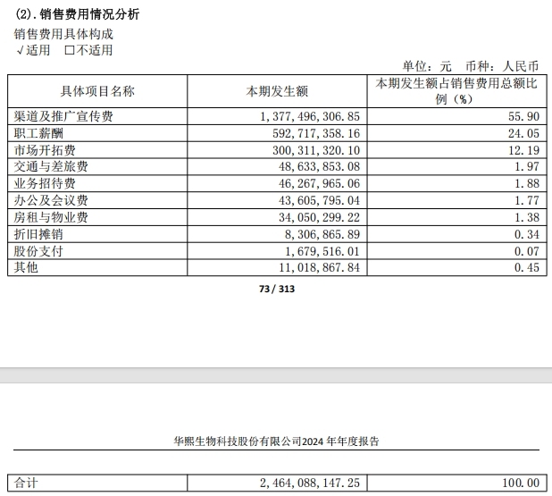 2024年,华熙生物的销售费用为24.64亿元,占总营收的比例为45.88%。