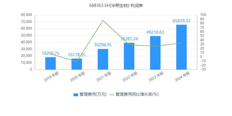 2019年至2024年,华熙生物年度管理费用总额及增速。图片来源:同花顺iFinD
