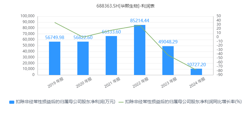 2023年,公司营收、扣非净利润分别为60.76亿元、4.90亿元,分别同比下降4.45%、42.44%。2024年,为华熙生物连续第二年营收及利润“双降”。