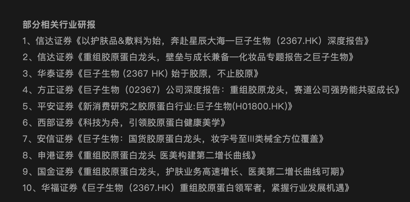 舆论之争背后,则有一条医美行业的暗线。按照华熙生物罗列的券商研报,部分聚焦于另一家主打重组胶原蛋白产品的巨头——巨子生物(02367.HK)。此外,文章的言辞,也有暗示券商研报存在为巨子生物“站台”行为。