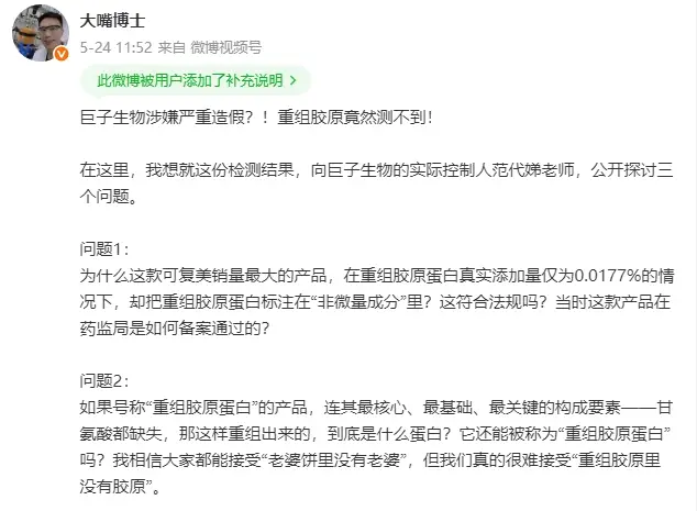 回顾时间线,5月24日,知名大V大嘴博士在微博发布了一则8分钟的视频,直指巨子生物旗下大单品可复美胶原蛋白精华的胶原蛋白含量造假。
