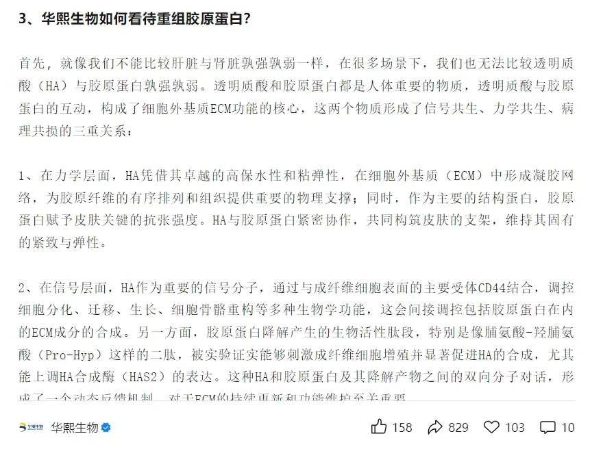 那么华熙生物是如何看待重组胶原蛋白的?5月21日,华熙生物在《眼前之巅与群山之险——答媒体及各界朋友》中提及,人体内的胶原蛋白和市场上的重组胶原蛋白产品有差异,两个概念不应该混用。