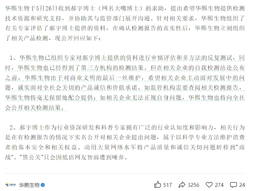 同日傍晚,华熙生物发文回应表示,其于5月26日收到大嘴博士的求助,希望华熙生物提供检查技术资源和研究支持。