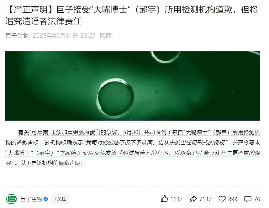 对于巨子生物的这份声明,大嘴博士在6月2日的发文中表示,无法确认巨子所使用的该检测机构声明的真实性,更无法确认这份疑点重重的声明在多大程度上反映了检测机构的真实理念。
