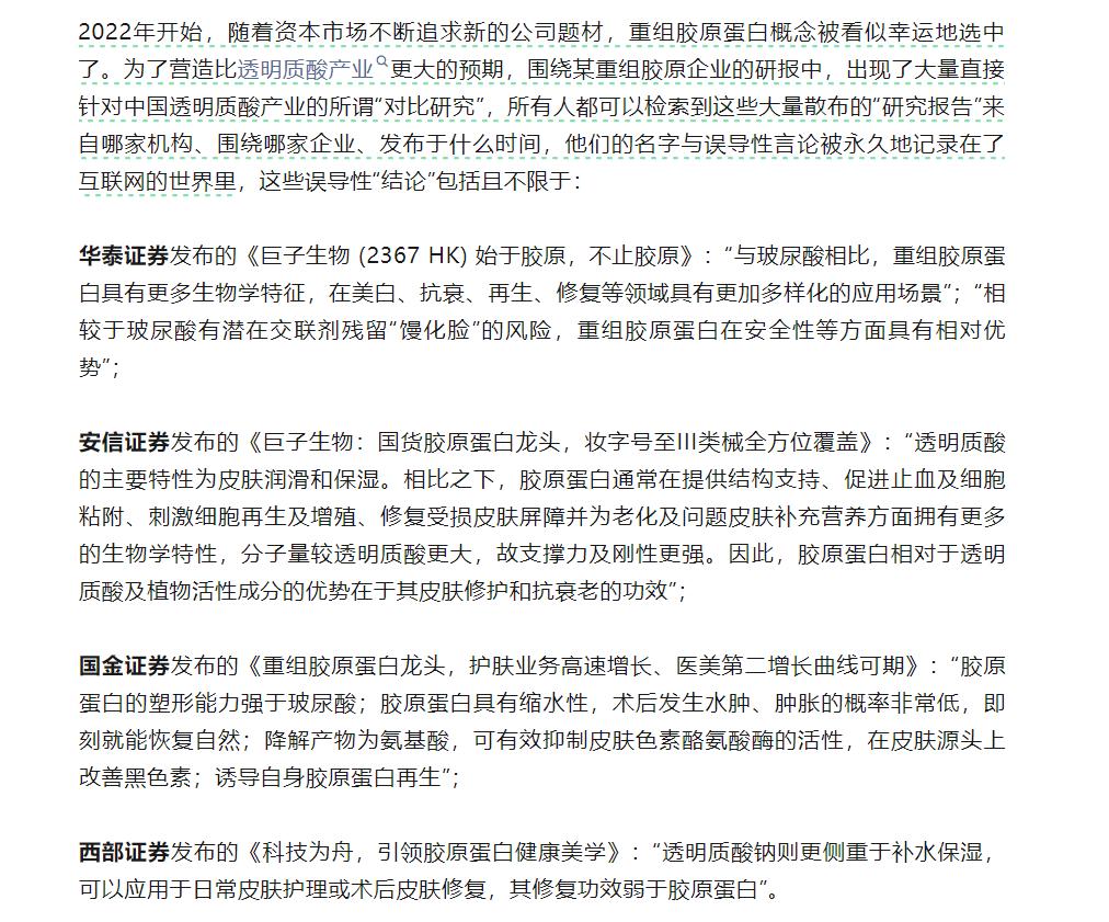 早在今年5月17日,华熙生物就在其官方公众号上发表了名为《概念总在重演,科技永远向前》的文章,在这篇文章的第一段“透明质酸过时的谎言从何而来”中,“点名”华泰证券、安信证券、国金证券、西部证券等,在研报中“贬低玻尿酸、抬高胶原蛋白”。并直言,资本市场与消费市场的舆论共振,伤害了经几代人努力的、一个中国优势产业的市场转化基础。